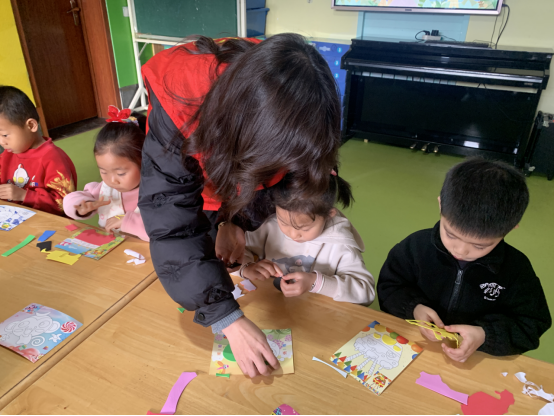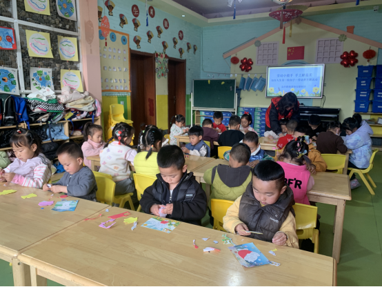 制作过程中,孩子们全程神情专注,小脸上满是认真投入的模样。遇到粘贴难题或造型困惑时,他们会主动举起小手向老师和志愿者请教,也会凑到小伙伴身边分享想法、互相帮忙调整贴纸位置。一双双稚嫩的小手在彩纸与贴纸间忙碌穿梭,眼神里藏着对创作的期待与专注。经过三十多分钟的用心打造,孩子们陆续完成了属于自己的手工作品,他们小心翼翼地捧着“杰作”举在胸前,小脸上绽放出掩饰不住的自豪笑容,那份纯粹的成就感感染着现场每一个人。