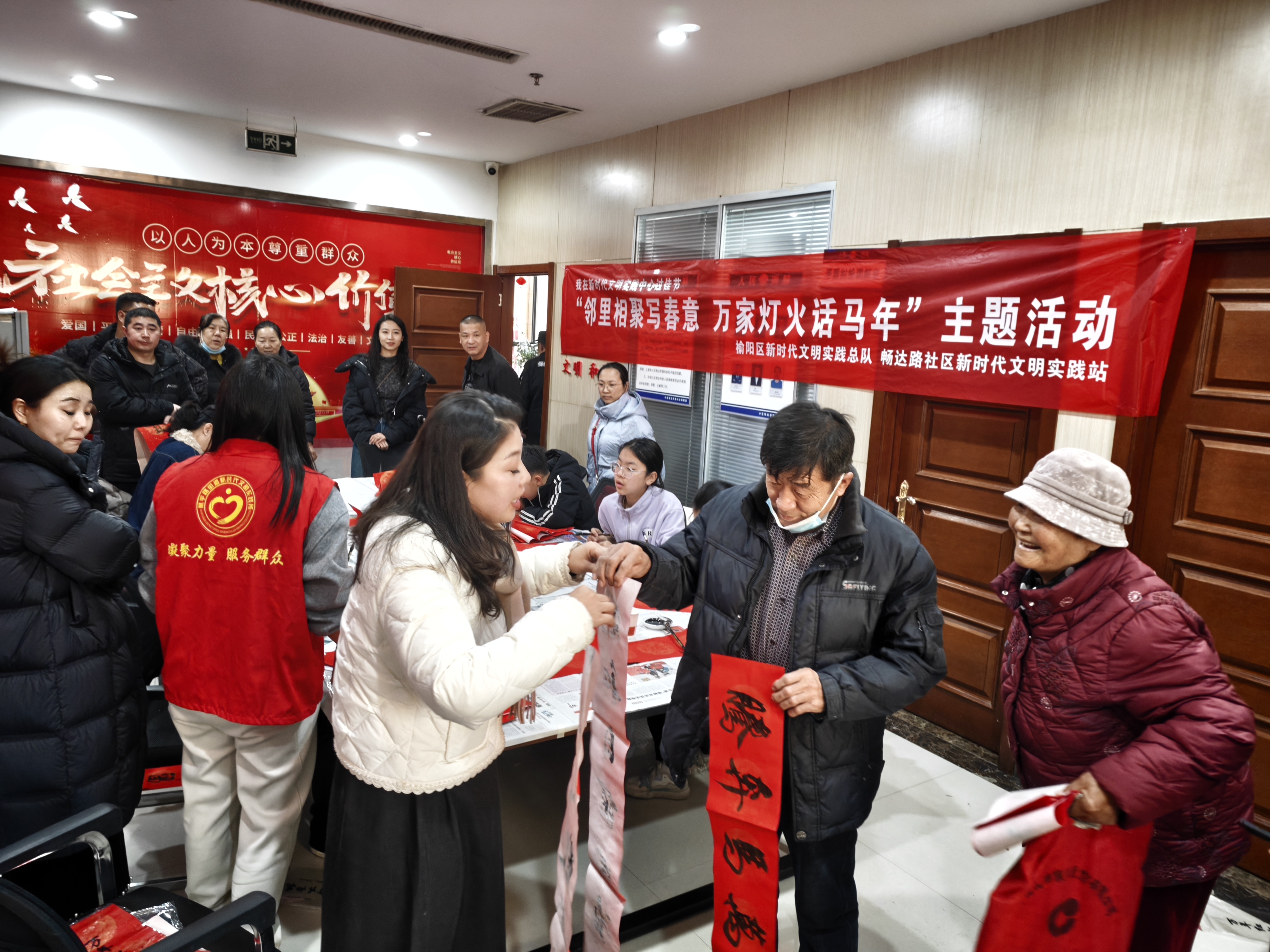 新春将至,年味渐浓。为传承中华优秀传统文化,营造喜庆祥和的节日氛围,增进邻里情谊,2月10日,航宇路街道畅达路社区在辖区九溪半岛小区开展“邻里相聚写春意, 万家灯火话马年”主题活动,把新春的美好祝福送到居民家门口。