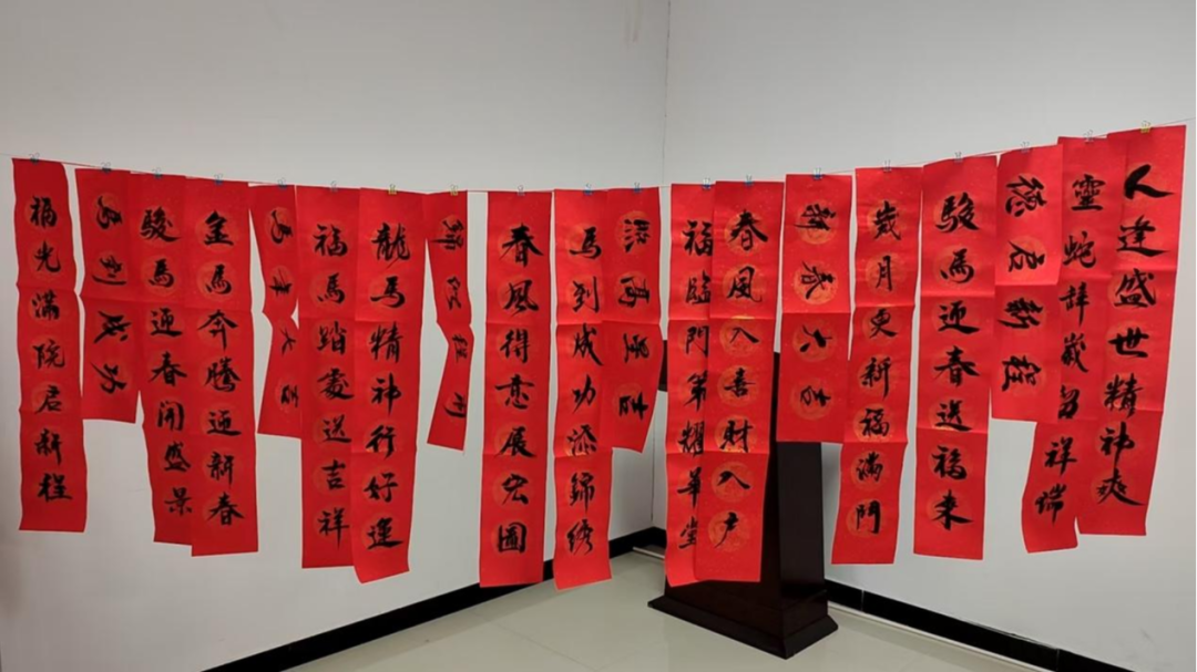 翰墨飘香写春联专区人气最旺。社区邀请书法爱好者与志愿者现场挥毫泼墨,红纸铺展、笔走龙蛇,一副副对仗工整、寓意吉祥的春联与大红“福”字跃然纸上。居民们有序挑选、满载而归,墨香里满是新春祝福。