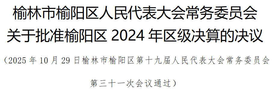 榆林市榆阳区第十九届人民代表大会常务委员会第三十一次会议,听取了区财政局局长张敏波受区人民政府委托作的《榆林市榆阳区人民政府关于2024年区级决算的报告》和区审计局局长谢静受区人民政府委托作的《榆林市榆阳区人民政府关于2024年度区级预算执行和其他财政收支的审计工作报告》。会议结合审议审计工作报告,对榆阳区2024年区级决算草案和决算报告进行了审查。会议同意区人大常委会预算工作委员会提出的审查意见报告,决定批准榆阳区2024年区级决算。