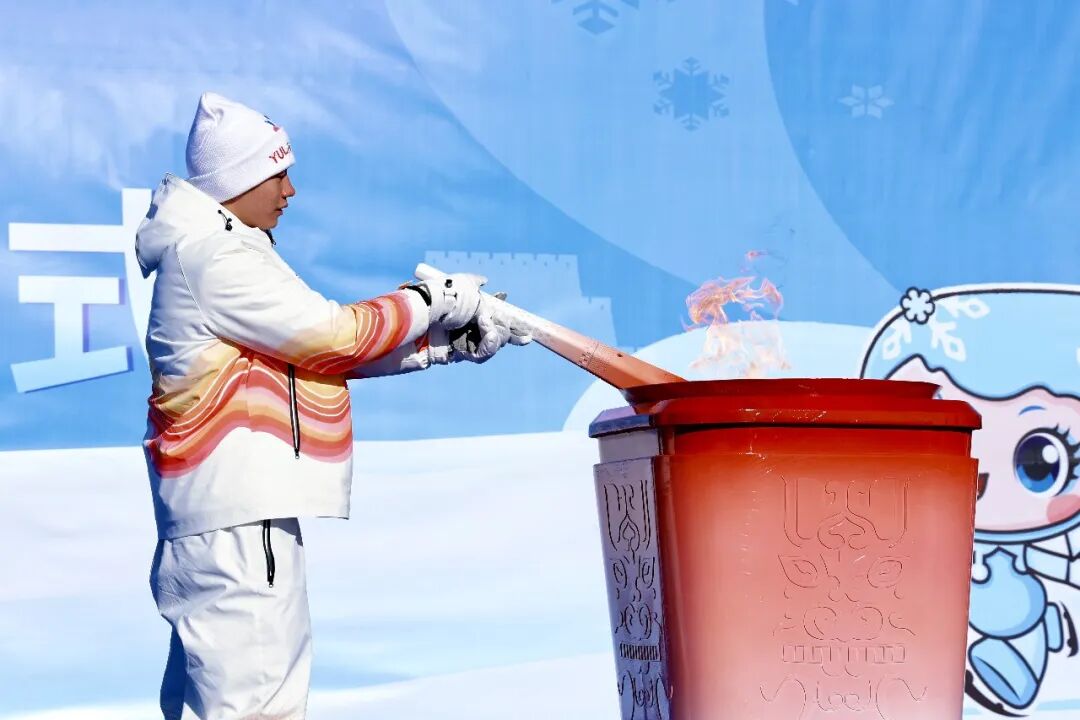上午12时许,最后一棒火炬手白钰豪跑上镇北台景区的收火仪式台,点燃火种盆。