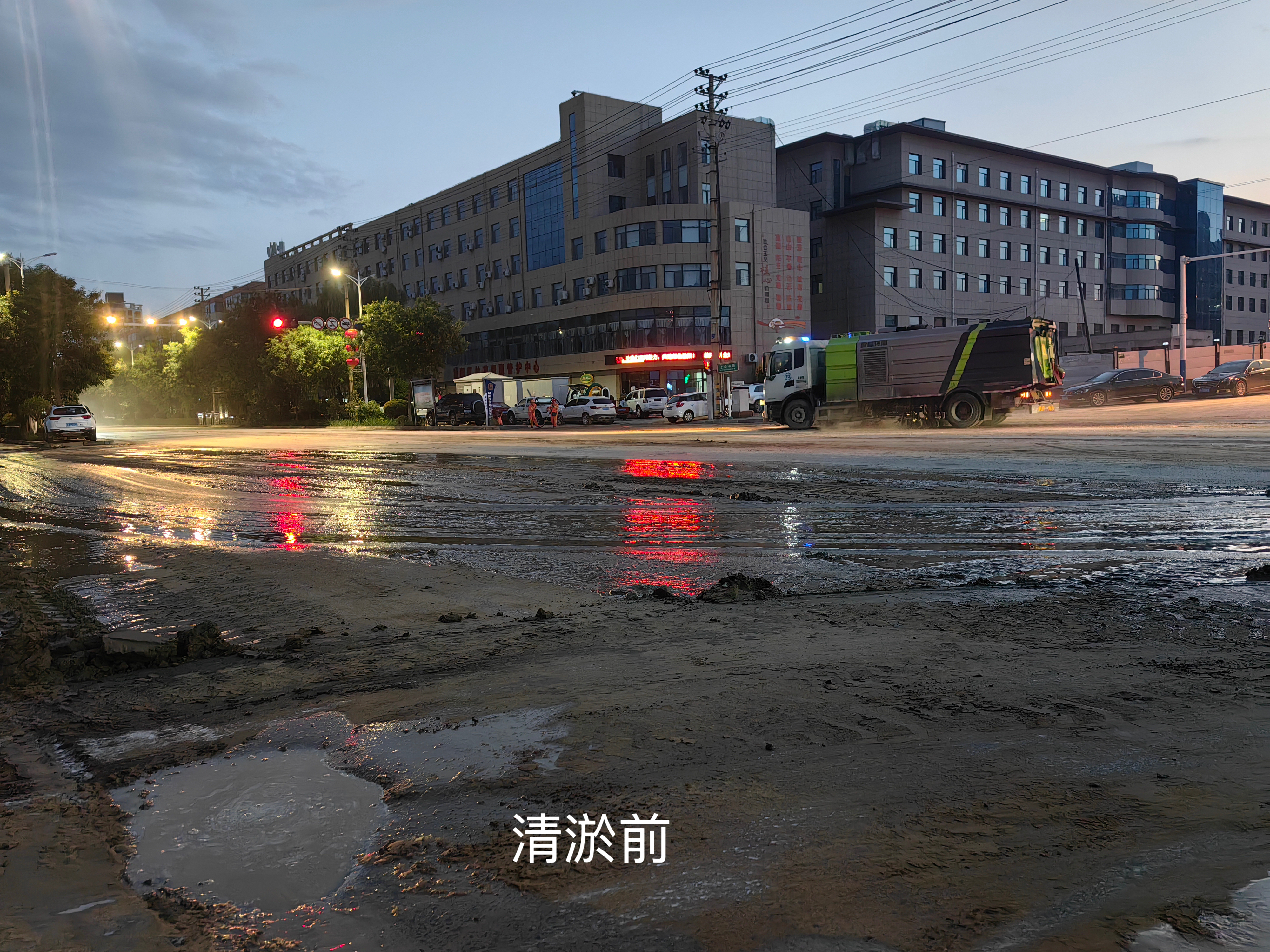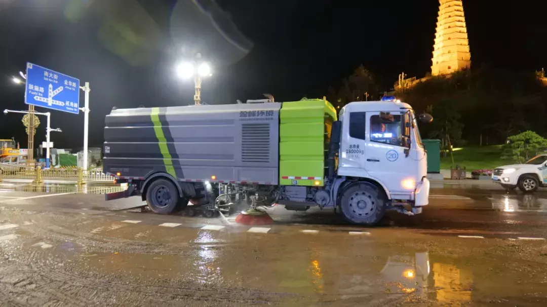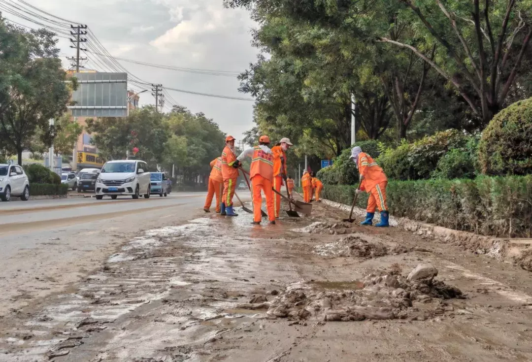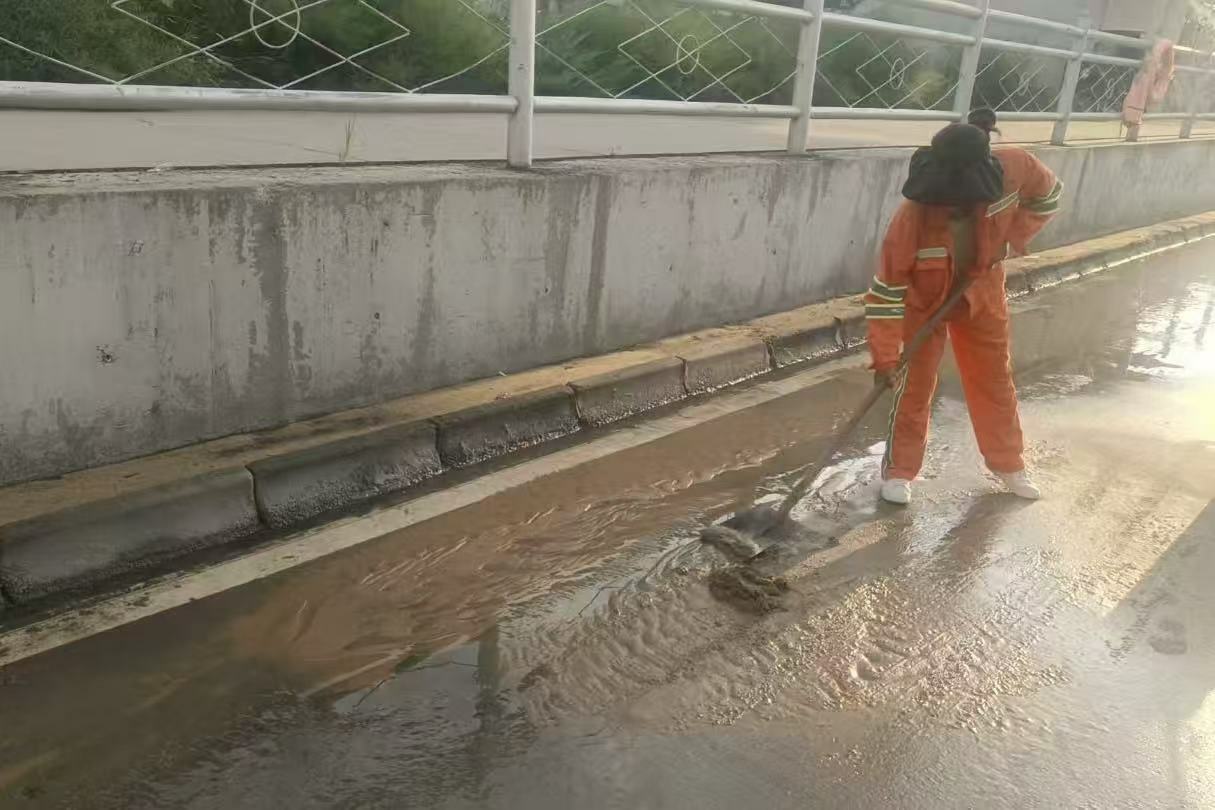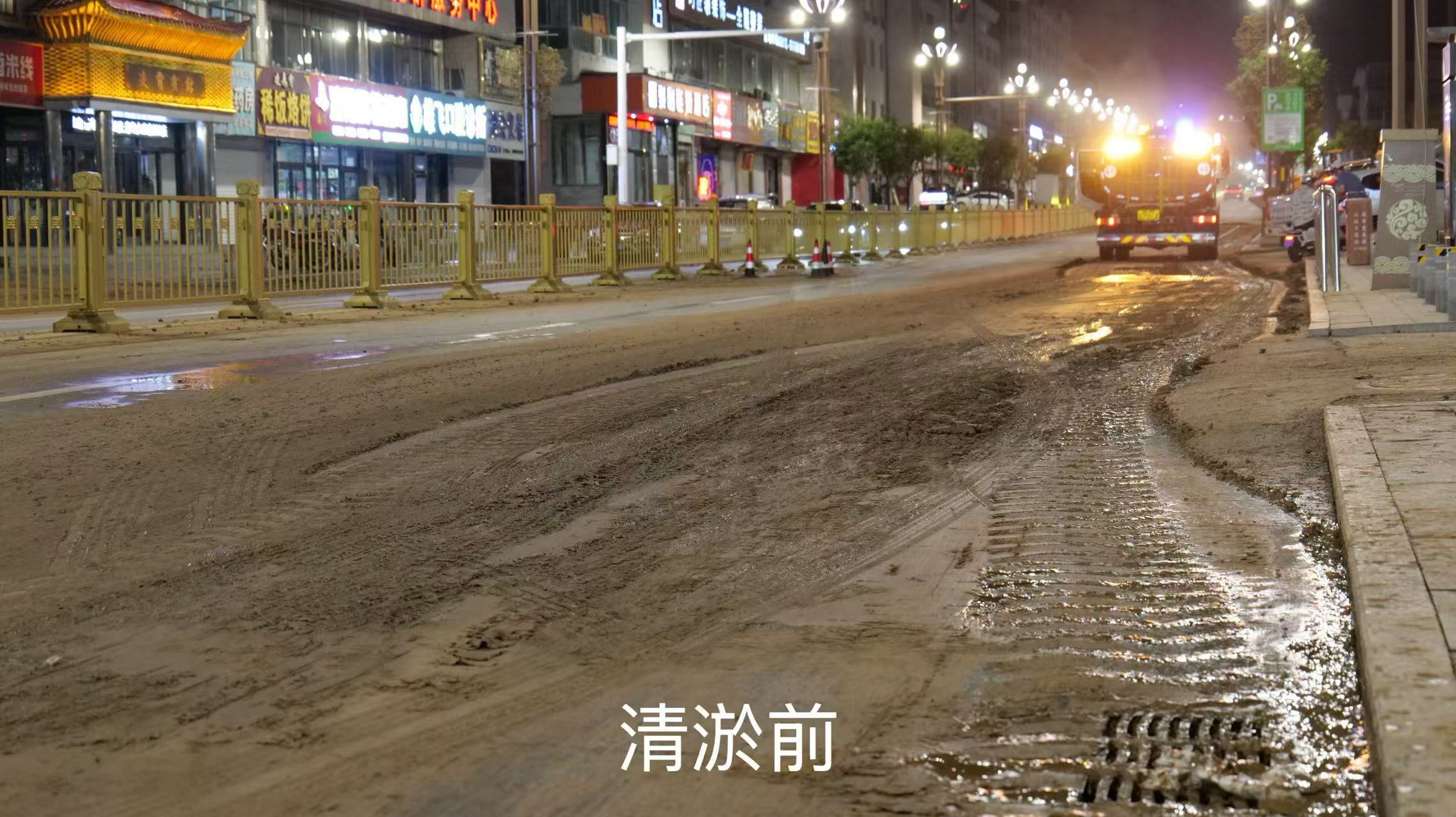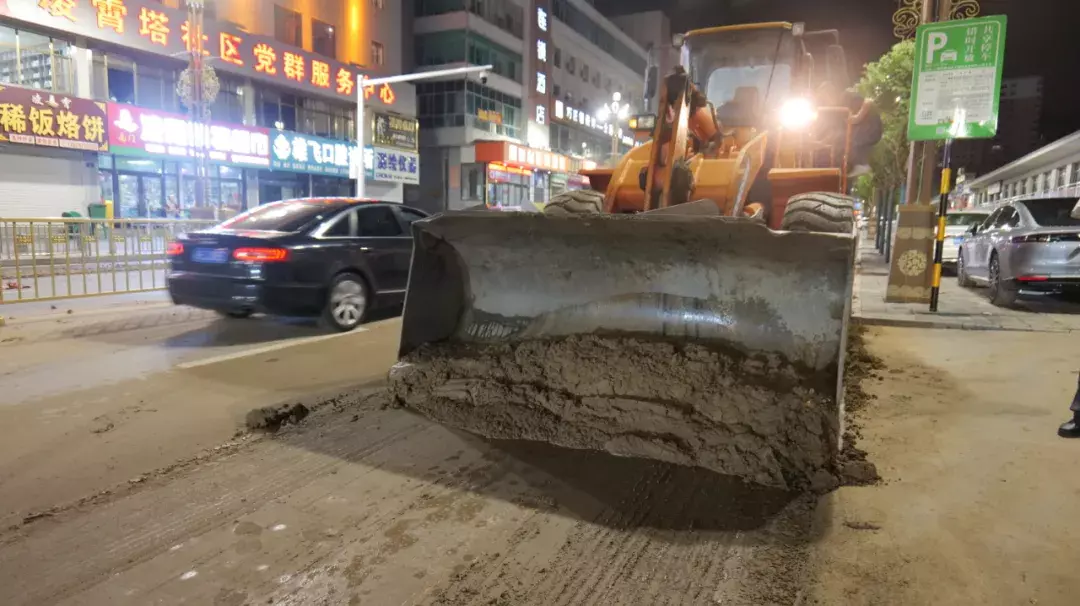 在南门口路段,清运车辆连夜开展清淤作业,清理成堆淤泥后,高压冲洗车随即对路面进行细致冲刷,原本被淤泥覆盖的沥青路面逐渐显露出干净的本色。