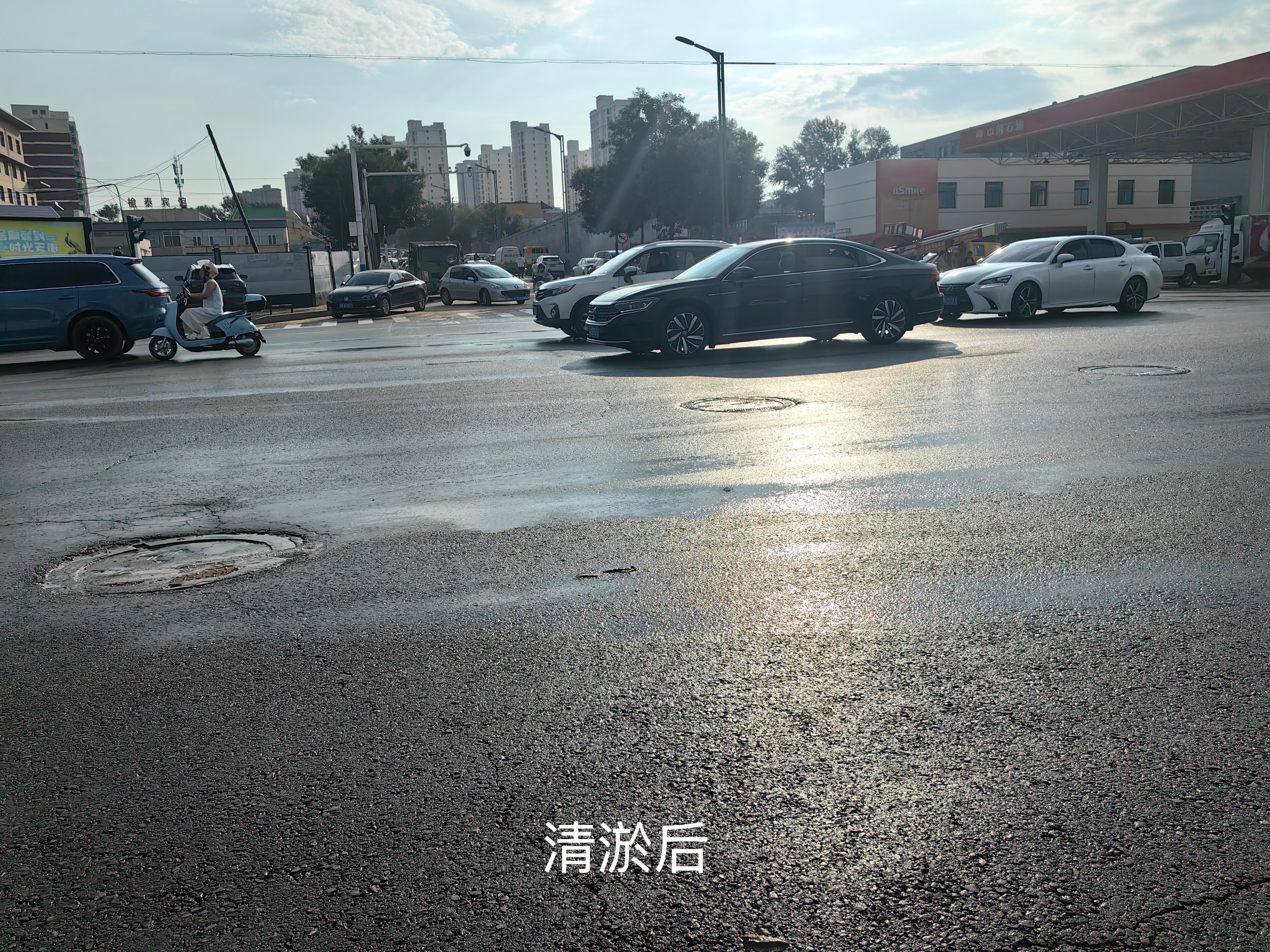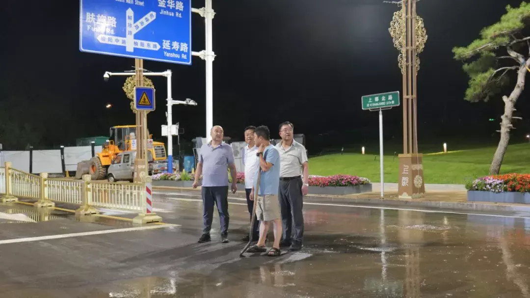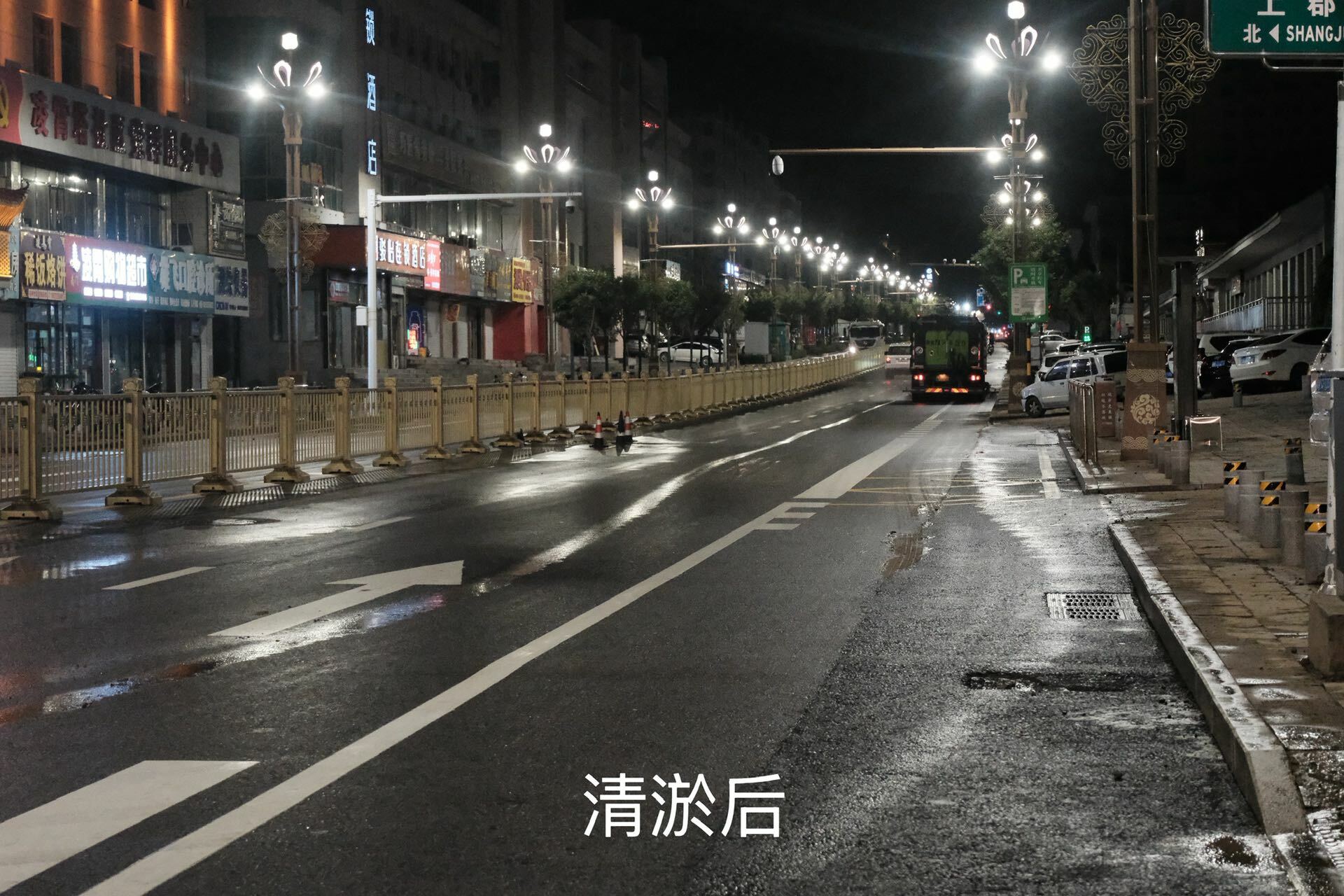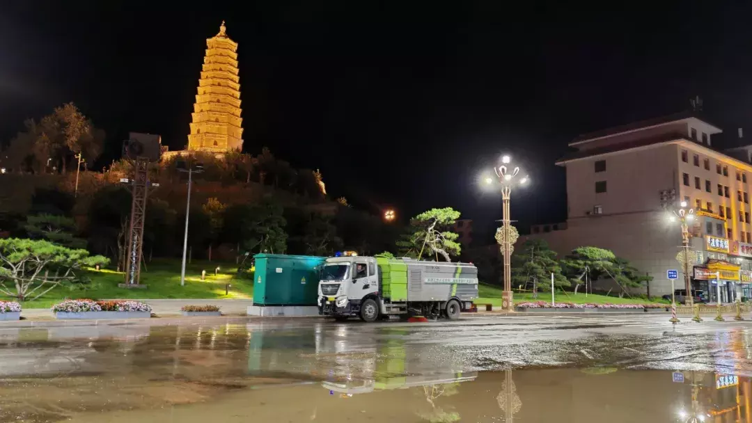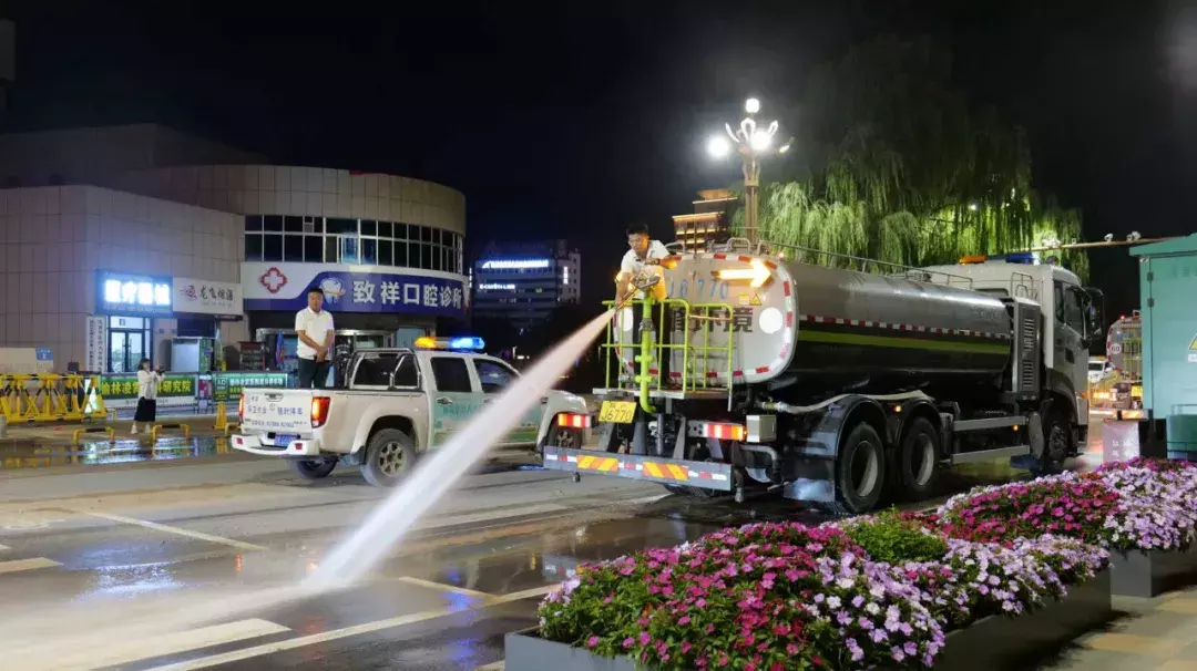 在南门口路段,清运车辆连夜开展清淤作业,清理成堆淤泥后,高压冲洗车随即对路面进行细致冲刷,原本被淤泥覆盖的沥青路面逐渐显露出干净的本色。