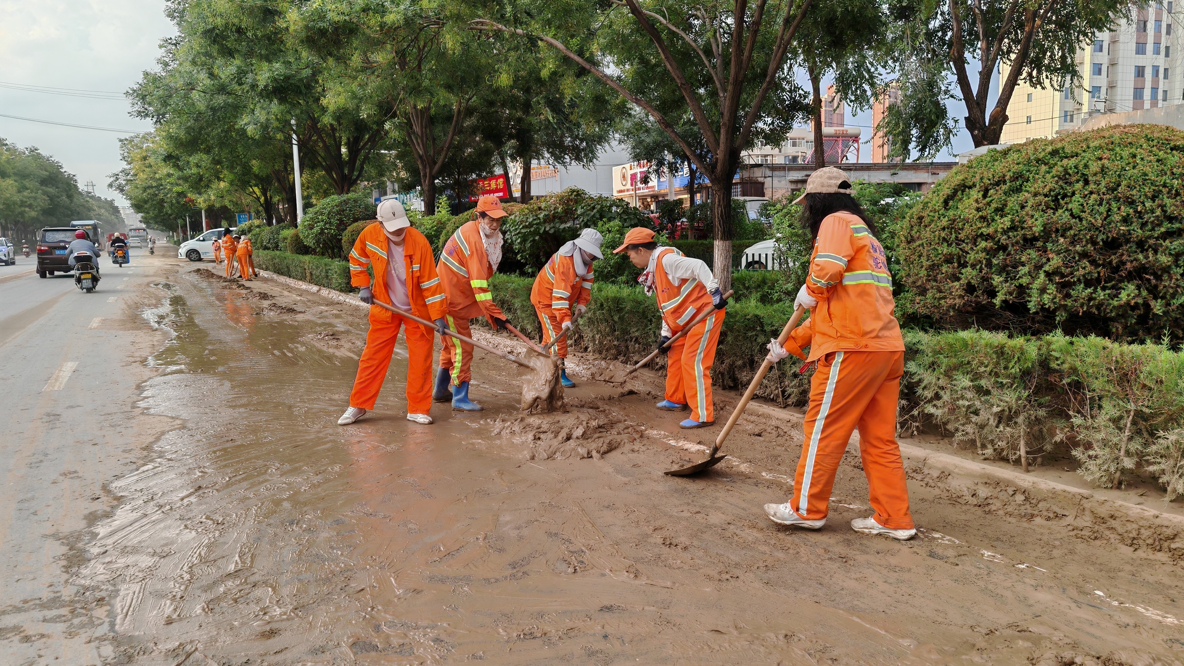 8月19日下午,暴雨突袭榆阳,致使路面快速积水,多条道路淤积了大量淤泥,给市民出行带来极大不便,同时存在安全隐患。雨势刚停,榆阳区环卫局便迅速行动,调集各类清运车辆,第一时间投入到清淤工作中。