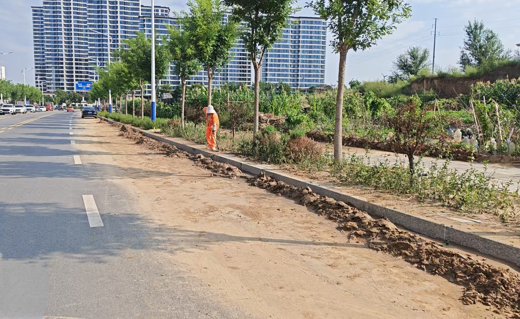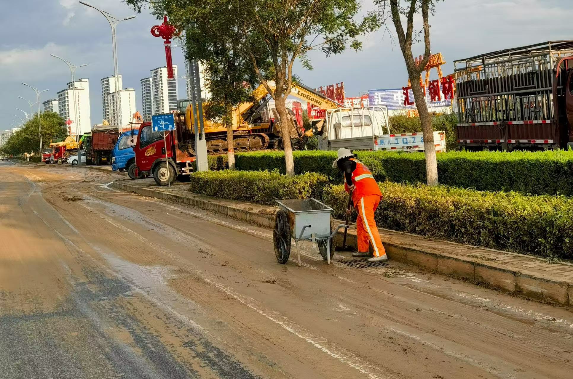 在淤泥堆积严重的上郡路与榆佳路路口及其他重点区域,环卫工人与机械车辆协同作战、高效配合,全力清理路面淤泥。