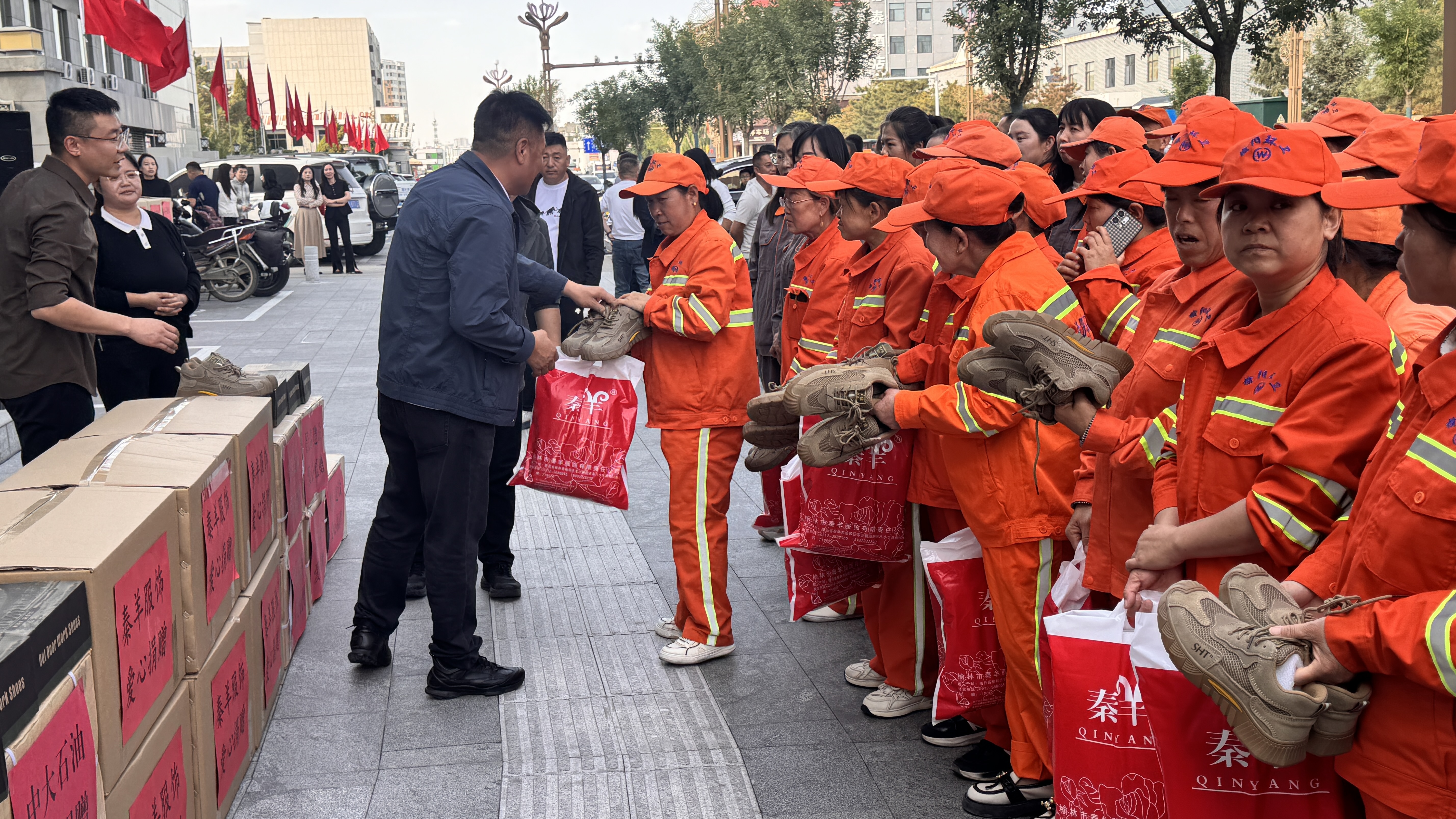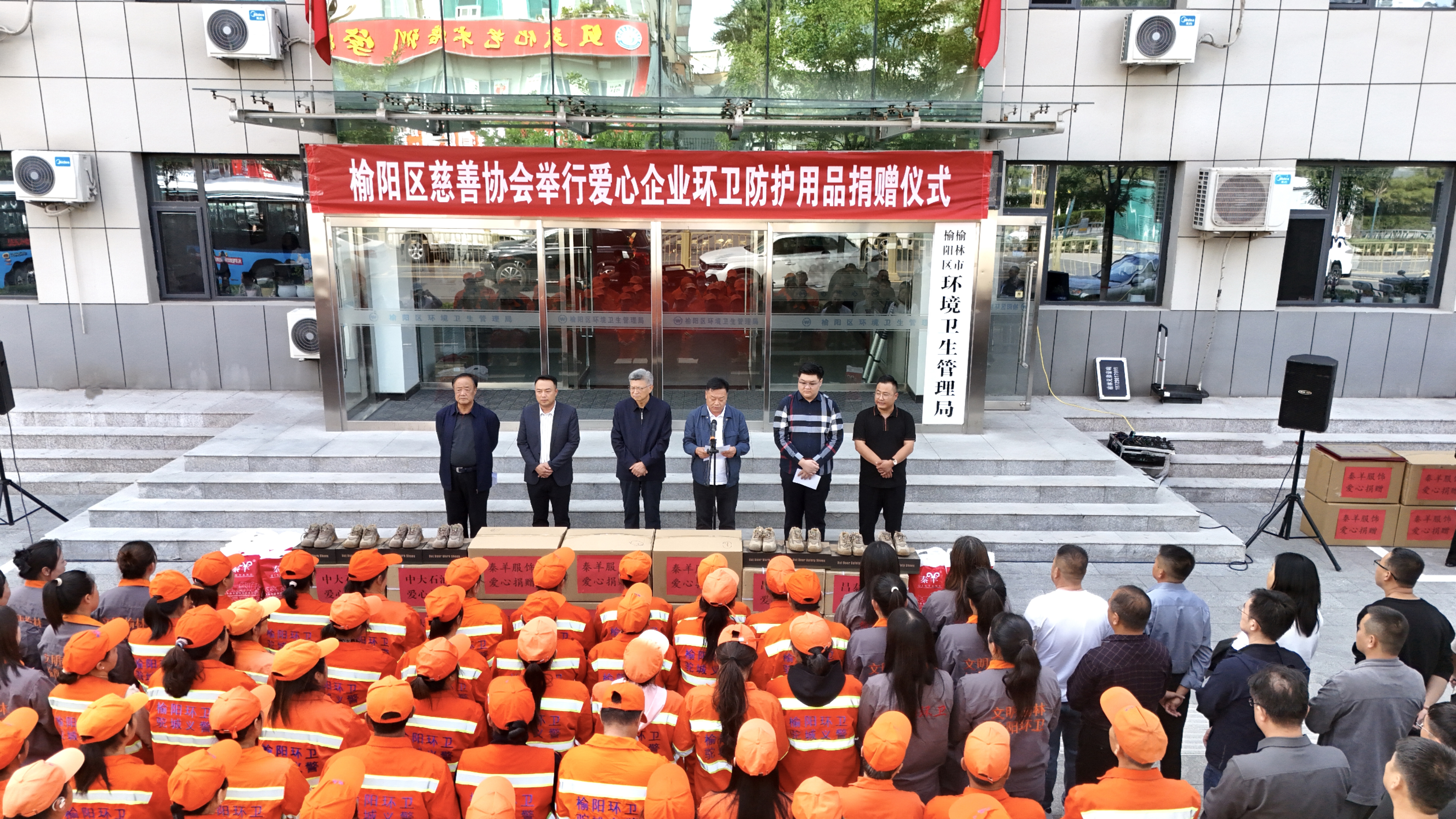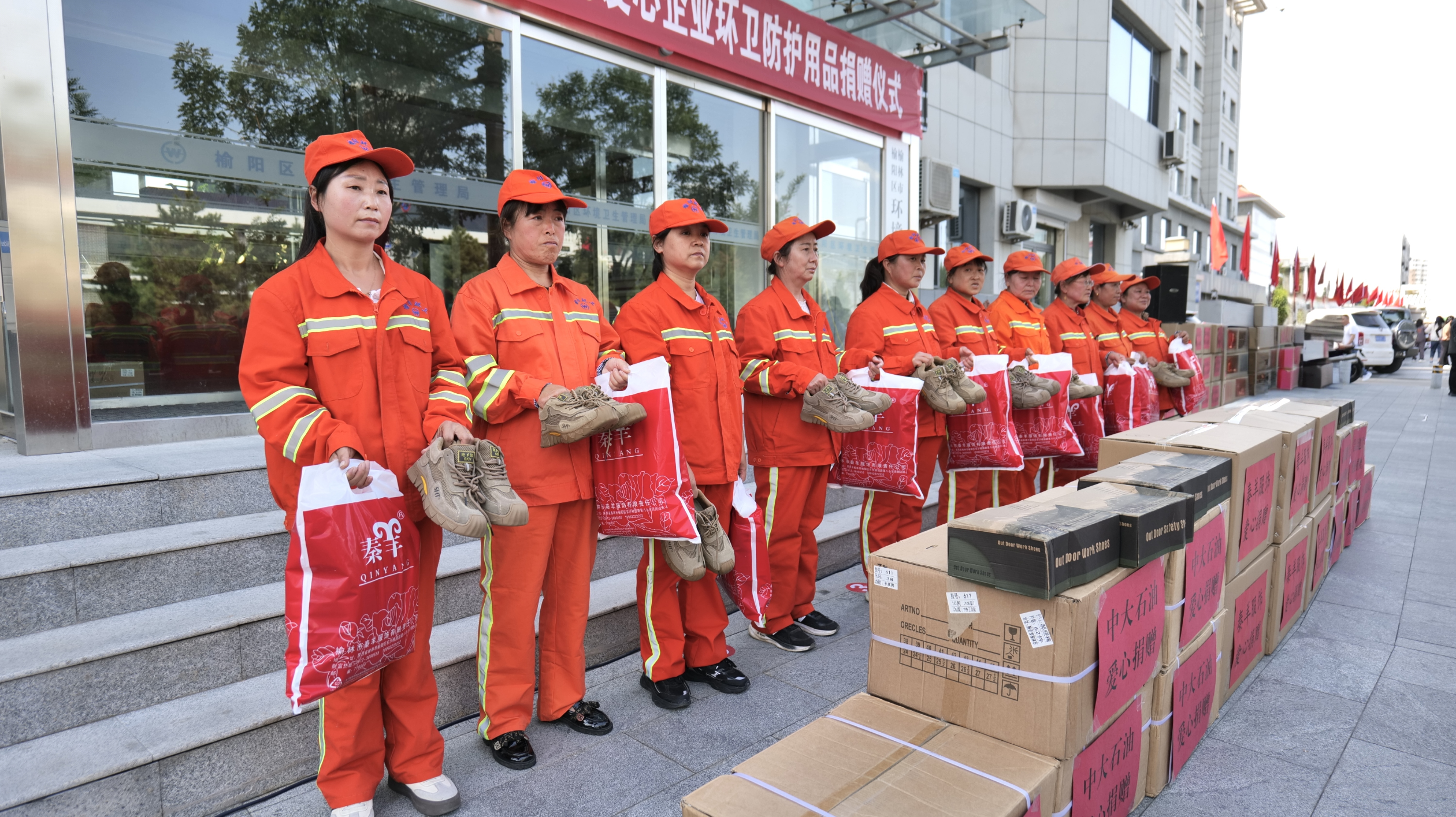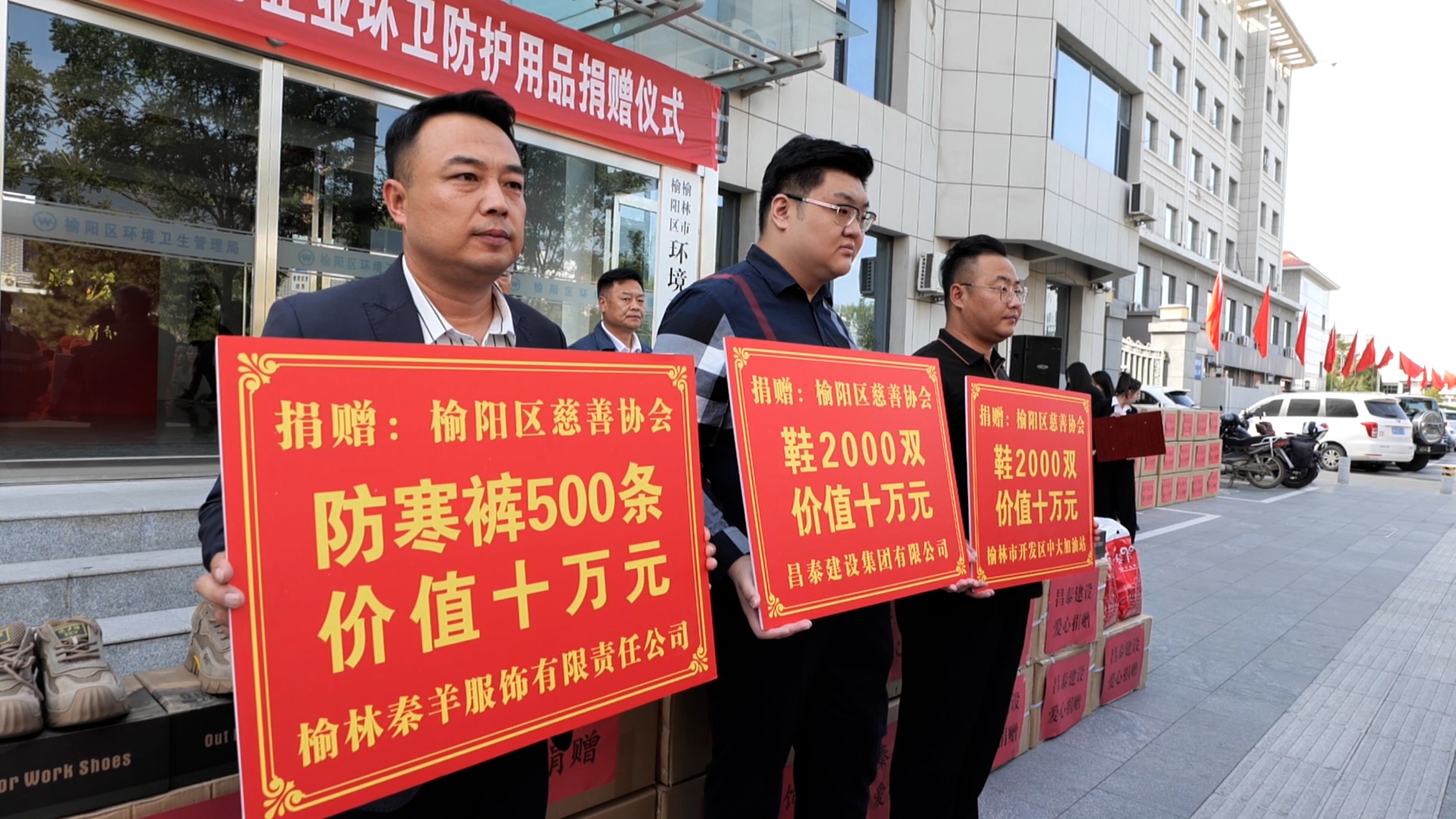 近日,榆阳区慈善协会举行爱心企业环卫防护用品捐赠仪式,榆林市开发区中大加油站、昌泰建设集团有限公司、榆林秦羊服饰有限责任公司向一线环卫工人捐赠价值30万元的暖鞋与防寒裤。区慈善协会会长刘铁牛、副会长乔建平,区环卫局党组书记、局长高永波,爱心企业负责人出席仪式,区环卫局干部职工及环卫工人代表参加活动。