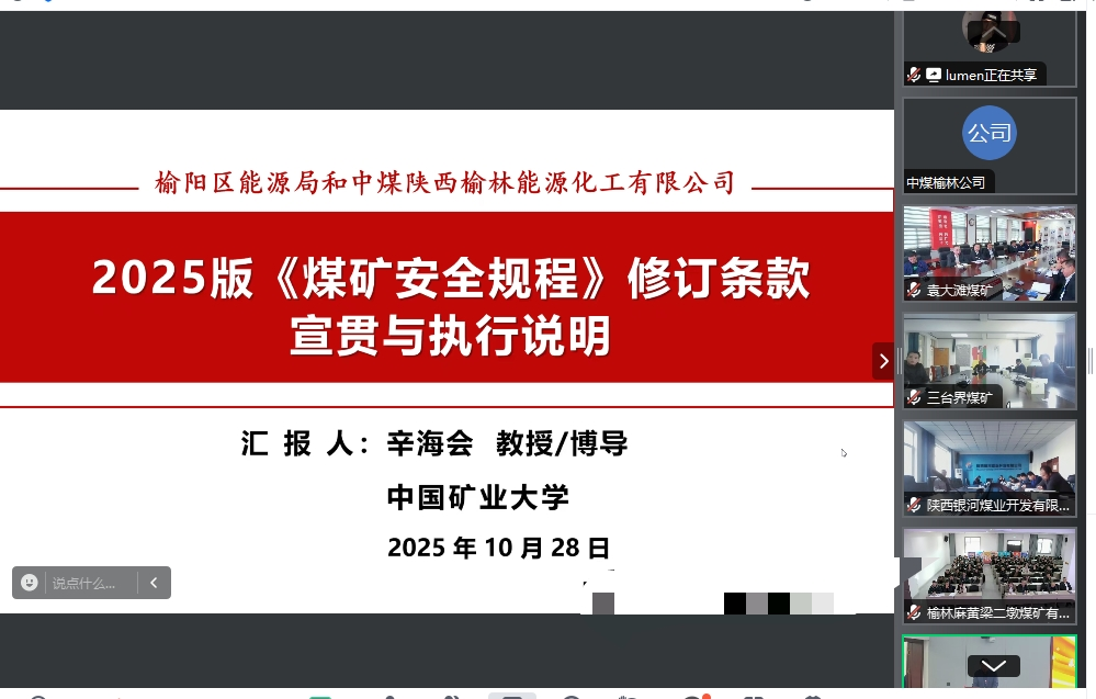 《煤矿安全规程》在煤矿安全生产领域居于主体规章地位,是煤矿企业、煤矿生产建设活动的基本准绳,也是能源局各有关科室日常检查执法的重要依据,为确保将学习宣传贯彻落到实处,筑牢我区煤矿安全生产工作根基,根据《国家矿山安全监察局关于贯彻落实《煤矿安全规程》的通知》(矿安〔2025〕101号)文件要求,我局组织开展全区2025年《煤矿安全规程》宣贯培训。本次宣贯培训于10月28日采用腾讯会议线上方式开展,主会场设在中煤陕西榆林能源化工有限公司大海则煤矿,分会场设在区内各煤矿,榆阳区能源局业务管理人员和驻矿安监员在主会场参加脱产培训学习,各煤矿通过视频会议形式参加。