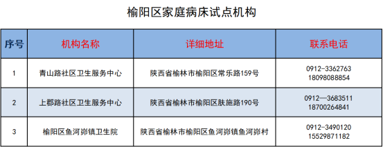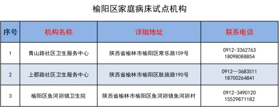 目前,榆阳区已确定3个基层医疗卫生机构为首批家庭病床服务试点机构,分别是: