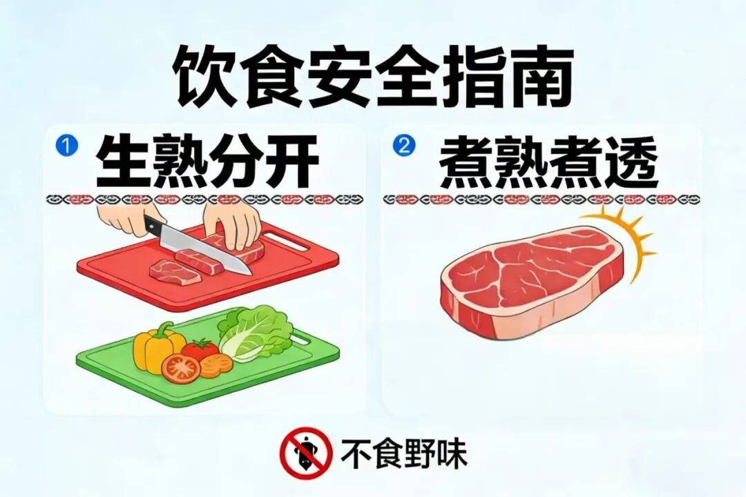 请严格遵守“生熟分开、煮熟煮透”的原则,肉类、禽类、水产品等务必彻底加热后方可食用。生食的瓜果、蔬菜要彻底清洗,不饮用生水。切勿采摘、购买或食用来源不明的野生动植物,谨防中毒。