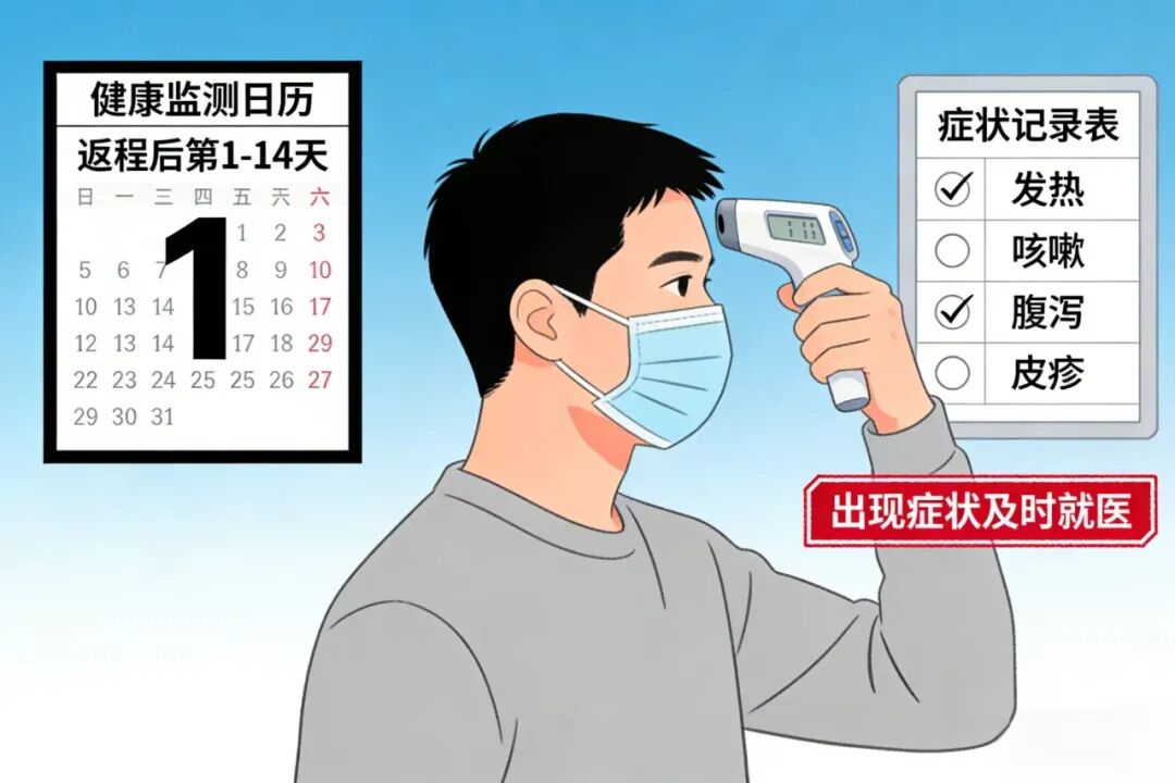 建议返程后的一到两周内,留意自身及家人的健康状况。如出现发热、咳嗽、腹泻、皮疹等不适症状,请做好个人防护,及时就医并告知旅行史,以便获得及时的指导与帮助。