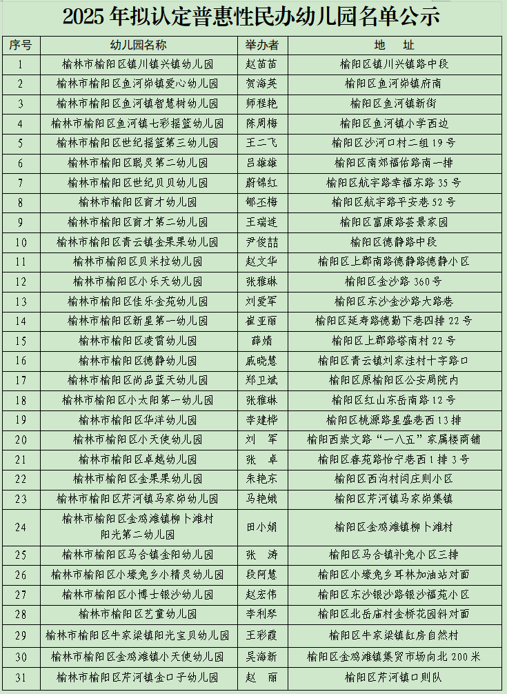 依据《陕西省普惠性民办幼儿园认定及管理办法》(陕教规范〔2024〕1号)《榆林市普惠性幼儿园认定及收费管理办法(试行)》(榆政教发〔2018〕58号)《榆阳区普惠性幼儿园认定及收费管理办法》(榆区政教发〔2018〕204号)文件精神,经区教体局综合考评,现将榆阳区2025年拟认定的31所普惠性民办幼儿园名单予以公示,公示期为2025年12月1日-2025年12月5日。