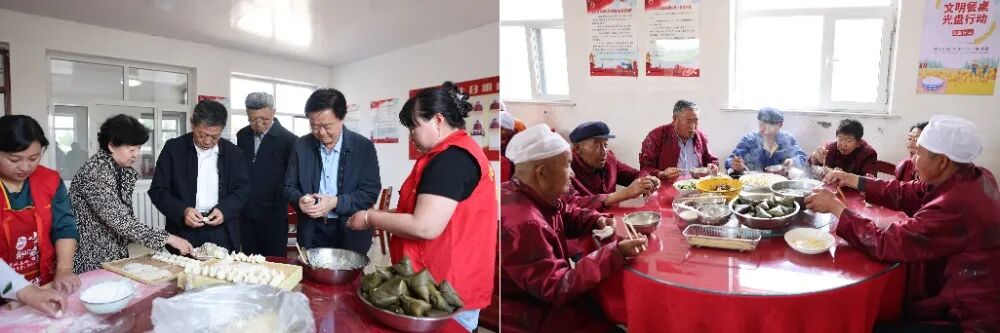 参观结束后,各位领导与志愿者们共同为老年人包饺子,吃粽子,提前和老年人们过端午佳节。