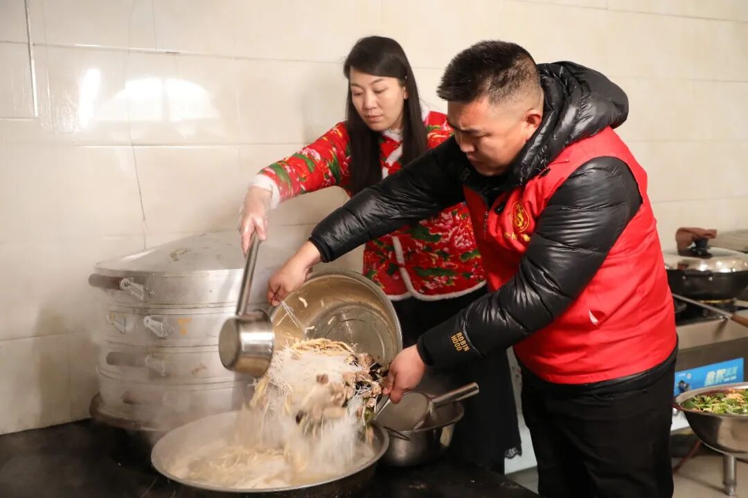 在古塔镇王岗畔村崔家河则组的老年幸福院里,灶火正旺,笑声朗朗。贾刚系着围裙,与妻子贺英带领志愿服务队正在现场烹制,大铁锅里羊肉汤翻滚,油锅中炸糕“滋滋”作响。不一会儿,贾刚便将一碗碗香气扑鼻的羊肉粉汤和一个个金黄酥软的油糕、油馍馍,亲手端到老人们手中。