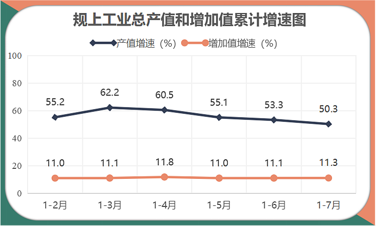 1-7月,全区规上工业完成总产值1036.26亿元,同比增长50.3%,增速较上半年回落3.0个百分点;增加值同比增长11.3%。