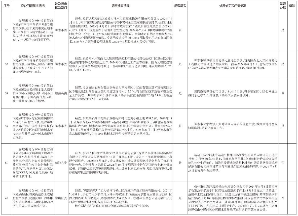 截至2024年8月6日12时,省第四生态环境保护督察组交办涉及榆林市生态环境信访件107件,现将第九批交办6件信访问题办理情况通报如下: