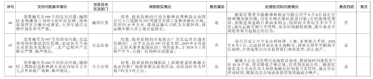 截至2024年8月8日12时,省第四生态环境保护督察组交办涉及榆林市生态环境信访件134件,现将第十一批交办3件信访问题办理情况通报如下: