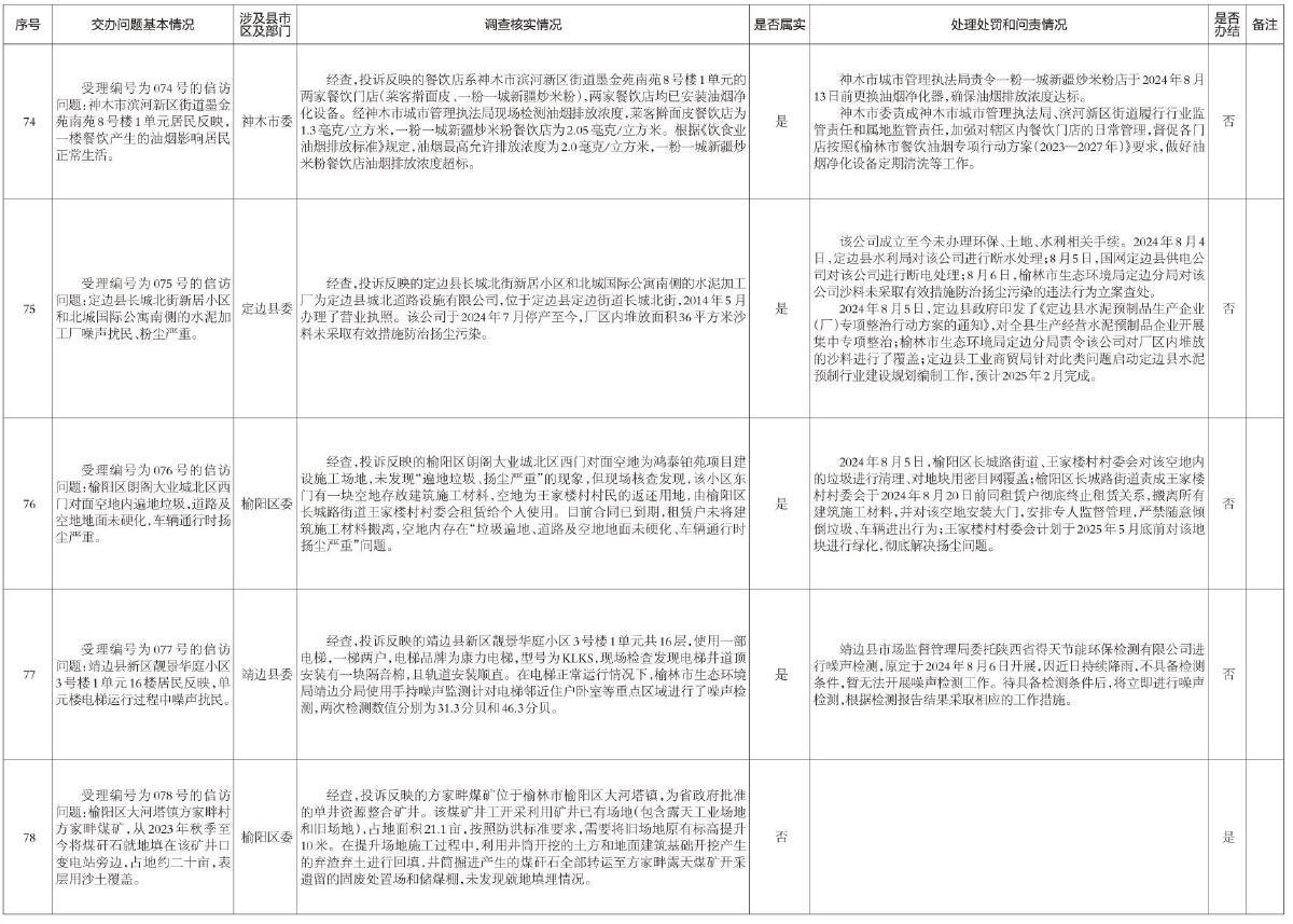 截至2024年8月10日12时,省第四生态环境保护督察组交办涉及榆林市生态环境信访件151件,现将第十三批交办5件信访问题办理情况通报如下: