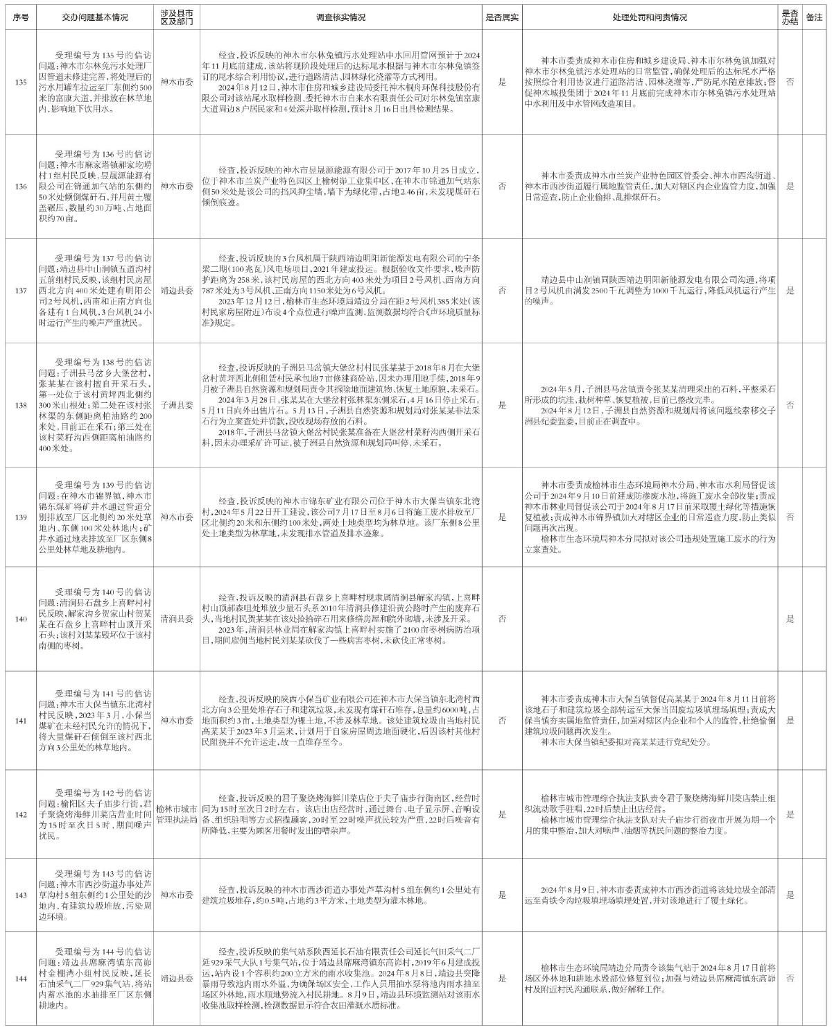 截至2024年8月15日12时,省第四生态环境保护督察组交办涉及榆林市生态环境信访件185件,现将第十八批交办10件信访问题办理情况通报如下: