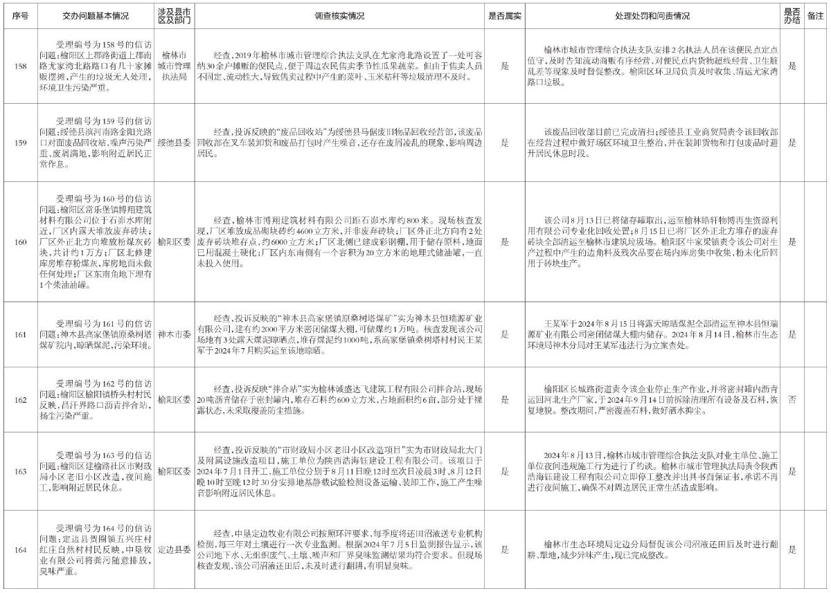 截至2024年8月18日12时,省第四生态环境保护督察组交办涉及榆林市生态环境信访件199件,现将第二十一批交办7件信访问题办理情况通报如下: