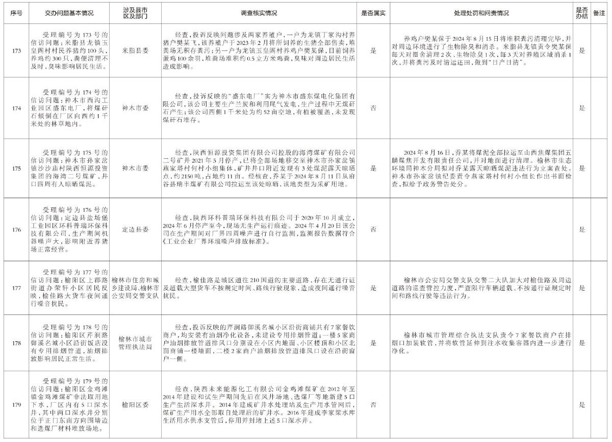 截止2024年8月20日20时,省第四生态环境保护督察组交办涉及榆林市生态环境信访件217件,现将第二十三批交办7件信访问题办理情况通报如下:
