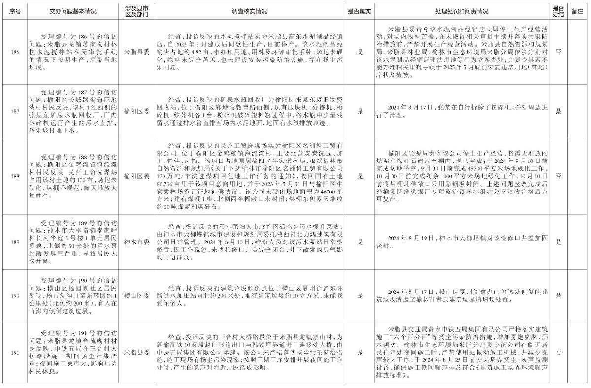 截止2024年8月20日20时,省第四生态环境保护督察组交办涉及榆林市生态环境信访件217件,现将第二十五批交办6件信访问题办理情况通报如下: