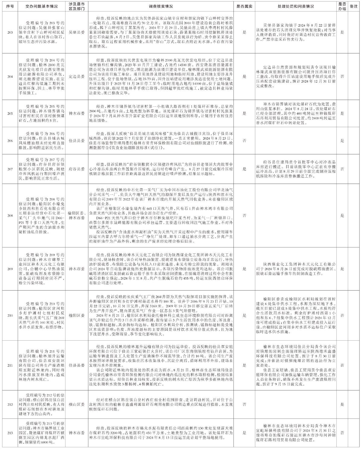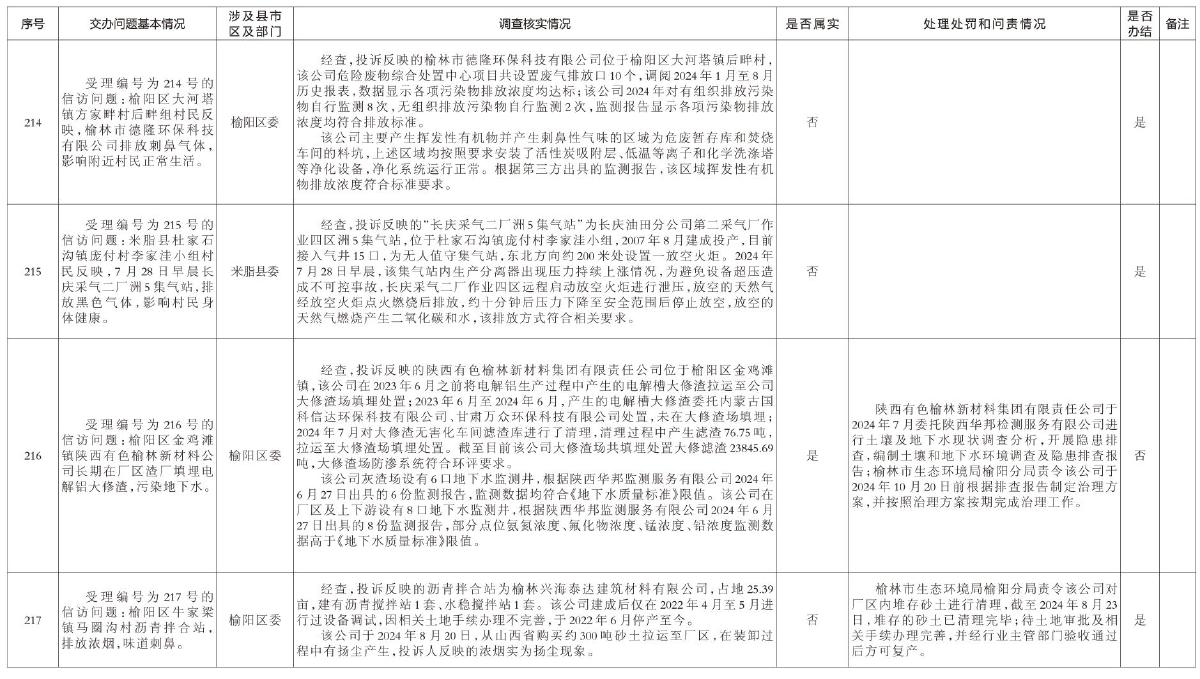 截止2024年8月20日20时,省第四生态环境保护督察组交办涉及榆林市生态环境信访件217件,现将第二十九批交办15件信访问题办理情况通报如下: