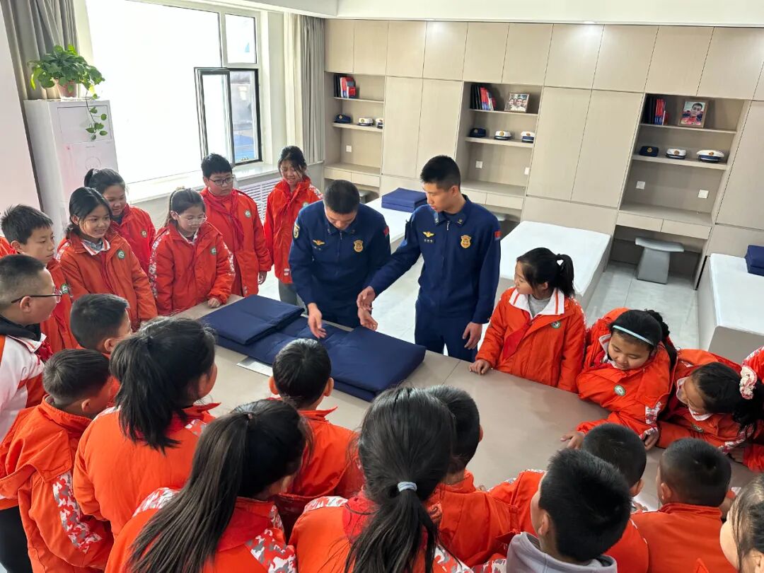 活动尾声,学生们走进消防救援人员的宿舍。当看到叠得方方正正、棱角分明的“豆腐块”被子时,孩子们忍不住拍手叫好。消防救援人员现场演示叠被子的步骤,从铺平被面、压实边角到捏出棱角,每个动作都细致规范,还耐心讲解操作要领,引导学生们将“精益求精、严于律己”的作风融入日常学习生活。随后,大家参观了区消防救援大队的荣誉室,消防救援人员通过一张张救援现场照片、一个个沉甸甸的奖杯奖牌,深情讲述背后的救援事迹,让孩子们深刻感悟“火焰蓝”忠诚担当、无私奉献的使命与担当。